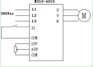 每套設備使用0.75KW變頻器和11KW變頻器;N310-2001-H1X負責拖動(dòng)牽引電機帶動(dòng)牽引輥對吹塑好的薄膜進(jìn)行牽引;N310-4015-H3X負責拖動(dòng)擠出機;牽引電機規格為0.75KW,50HZ,3.1A,1400RPM,帶有減速機;擠出電機規格為:380V,11KW,22.6A,1400RPM,50HZ,帶冷卻風(fēng)機,規格為95W,380V,50HZ,1400RPM;