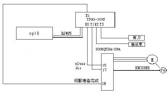 切紙機械是印刷和包裝行業(yè)常用的設備之一。切紙機完成的基本動(dòng)作是把待裁切的材料送到指定位置,然后進(jìn)行裁切。其控制的核心是一個(gè)單軸定位控制。目前國內進(jìn)行切紙設備進(jìn)給定位系統主要有兩種方式,一是利用PLC結合變頻器實(shí)現,一是利用PLC結合伺服系統實(shí)現,從效率上來(lái)說(shuō)伺服相對變頻器要高很多。這次我們結合客戶(hù)設備的特點(diǎn)提出了一套方案,文本(OP10)+PLC(TP03-20HT)+伺服(JSDE-20A)進(jìn)行裁切參數設定和完成一些手動(dòng)動(dòng)作。